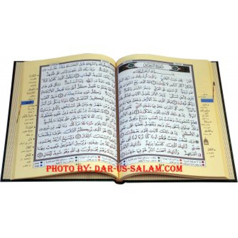 The publishers have designed the text to show the rules of tajweed when reading the Qur'an. The text is written in Uthmani style and has case vowelization and dotting on the letters that are audible. Letters related to tajweed rules are distinguished within the text by the use of colors, indicating the various tajweed rules. This technique helps simplify the rules of recitation for the reader in order to encourage and facilitate correct Qur’anic recitation. The text is color-coded: grey indicates when a letter is not pronounced, red indicates letters which require expanded vocalization, green indicates nasalization and blue shows the emphatic pronunciation of the letter.